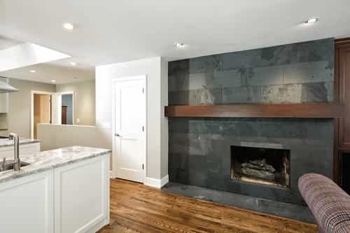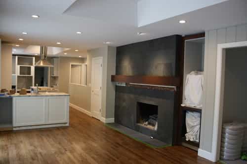 The black slate fireplace with custom cherry mantle and embedded media cabinet was another challenge. First, the cabinet was installed, including metal storage box for firewood. Tile was laid to the face of the cabinet and top point of the mantle. The mantle was then fabricated to fit both tile and cabinet. Finally, the slate was finished to the mantle to create a fully-embedded look. The finished product creates a striking contrast with bright, clean lines.