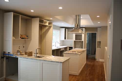 Tray ceilings were framed to create vertical space and architectural interest. One tray would house a ceiling fan, while the other would house a suspended range hood. An eye towards finish was required during framing, so the finished hood could be centered within the tray, and centered above the island.