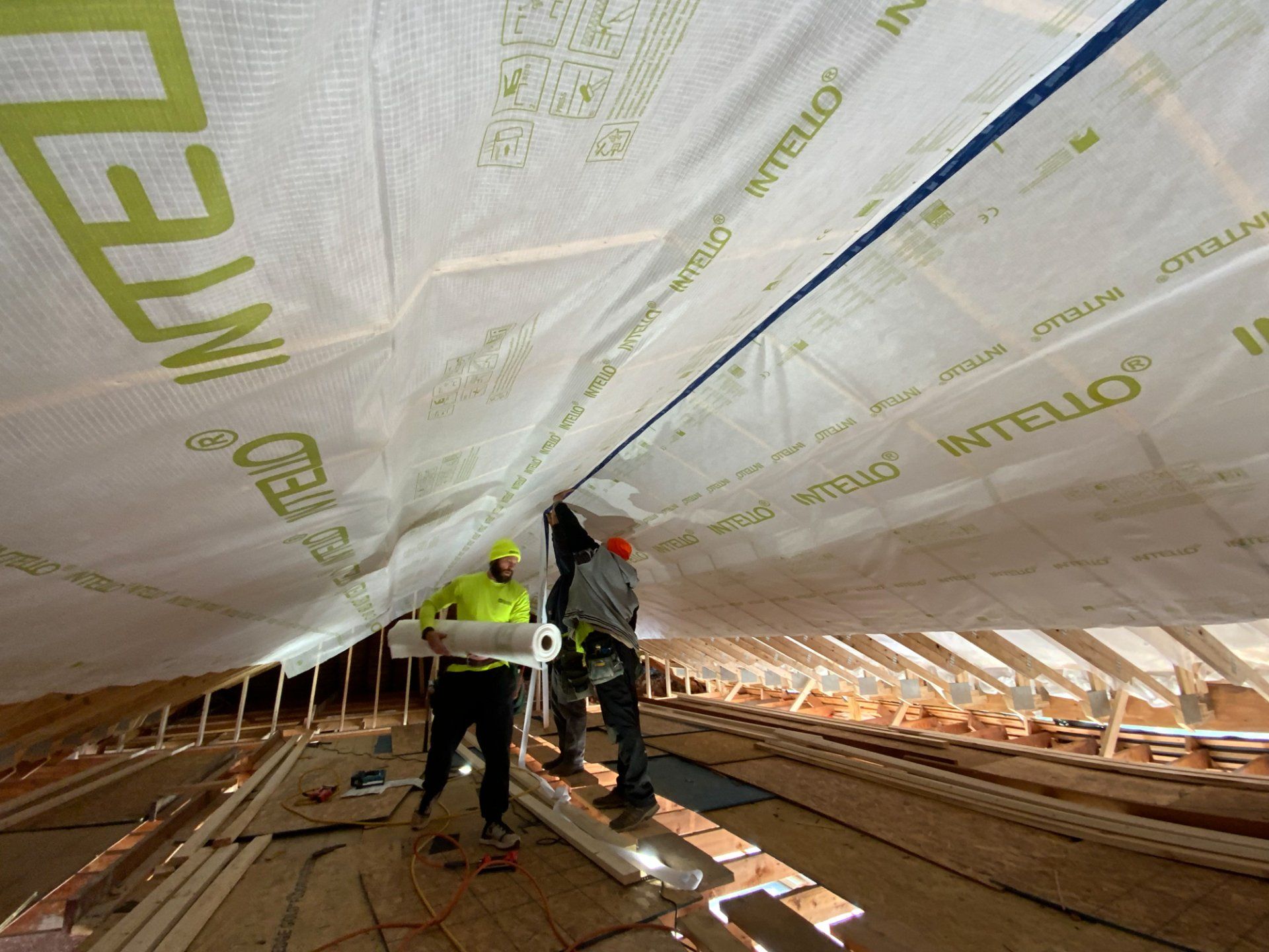 Our climate is a tough one to build in because of our harsh winters and hot/humid summers. Each year our summers seem to get even hotter with higher humidity levels year over year, putting even greater importance on mitigating moisture in our homes. The Intello barrier is air tight but vapor open, meaning moisture is able to escape. Moisture getting caught in the walls can lead to mold and other harmful effects. It’s vital to the building’s longevity and overall health of its occupants that moisture is able to escape.